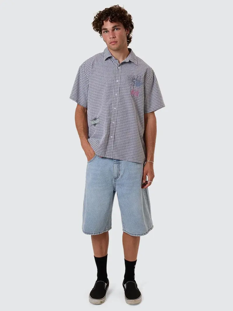 Your go-to when your casual cotton shorts are not enough, the Big Slacker Denim Short in Dusk delivers heavyweight build and low-effort cool. Made from heavy-wearing cotton denim blend, it features a wide, long-line fit with a serious streetwear edge. The dusk wash keeps it vintage, while the 5-pocket styling keeps it versatile, easy to pair with men's fashion shirts, muscle tees or worn-down flannels. Designed to ride loose, loud, and unapologetically oversized, these are summer shorts Australia staples with a nod to 90s skate and garage days.