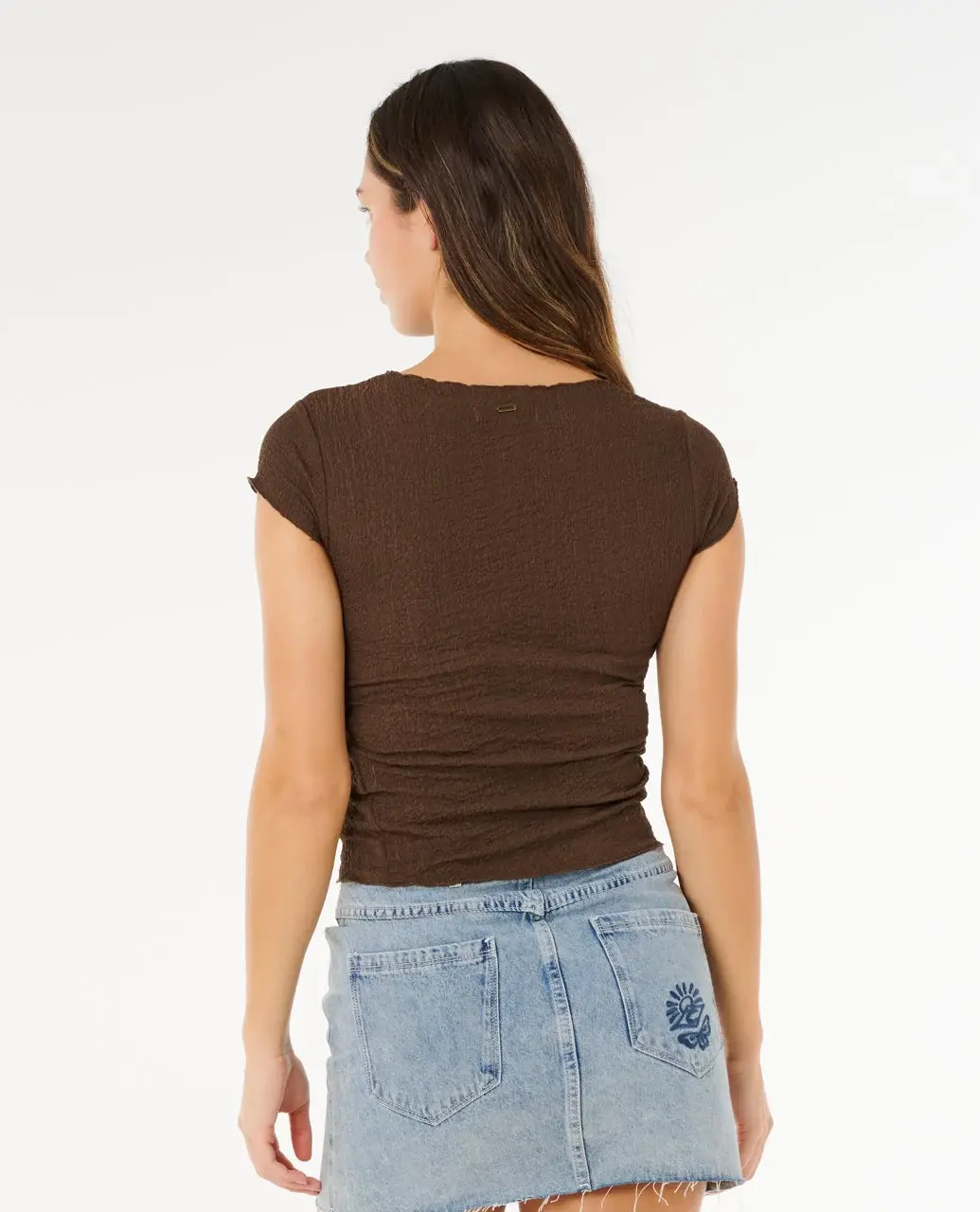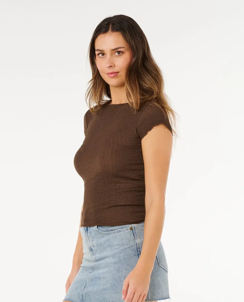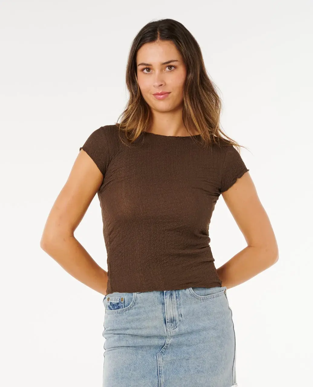 Fitted and flattering, the Coastal Short Sleeve Top combines soft stretch crinkle fabric with a surf-inspired silhouette, finished with a metal logo trim for a clean edge.