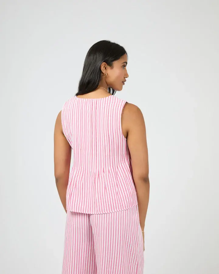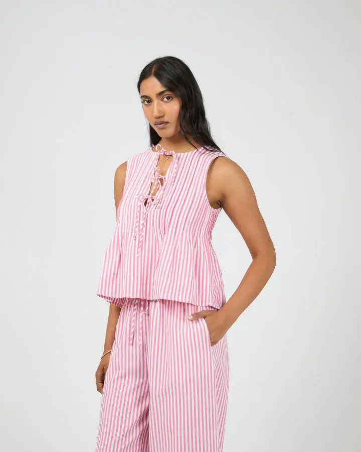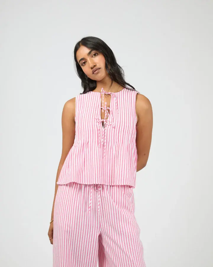 Fresh, feminine and made for warm summer days — the Franca Stripe Top is the perfect blend of pretty and effortless. Featuring soft pink and white vertical stripes and a gorgeous double-tie front detail, this sleeveless top brings a sweet, elevated touch to any casual outfit.