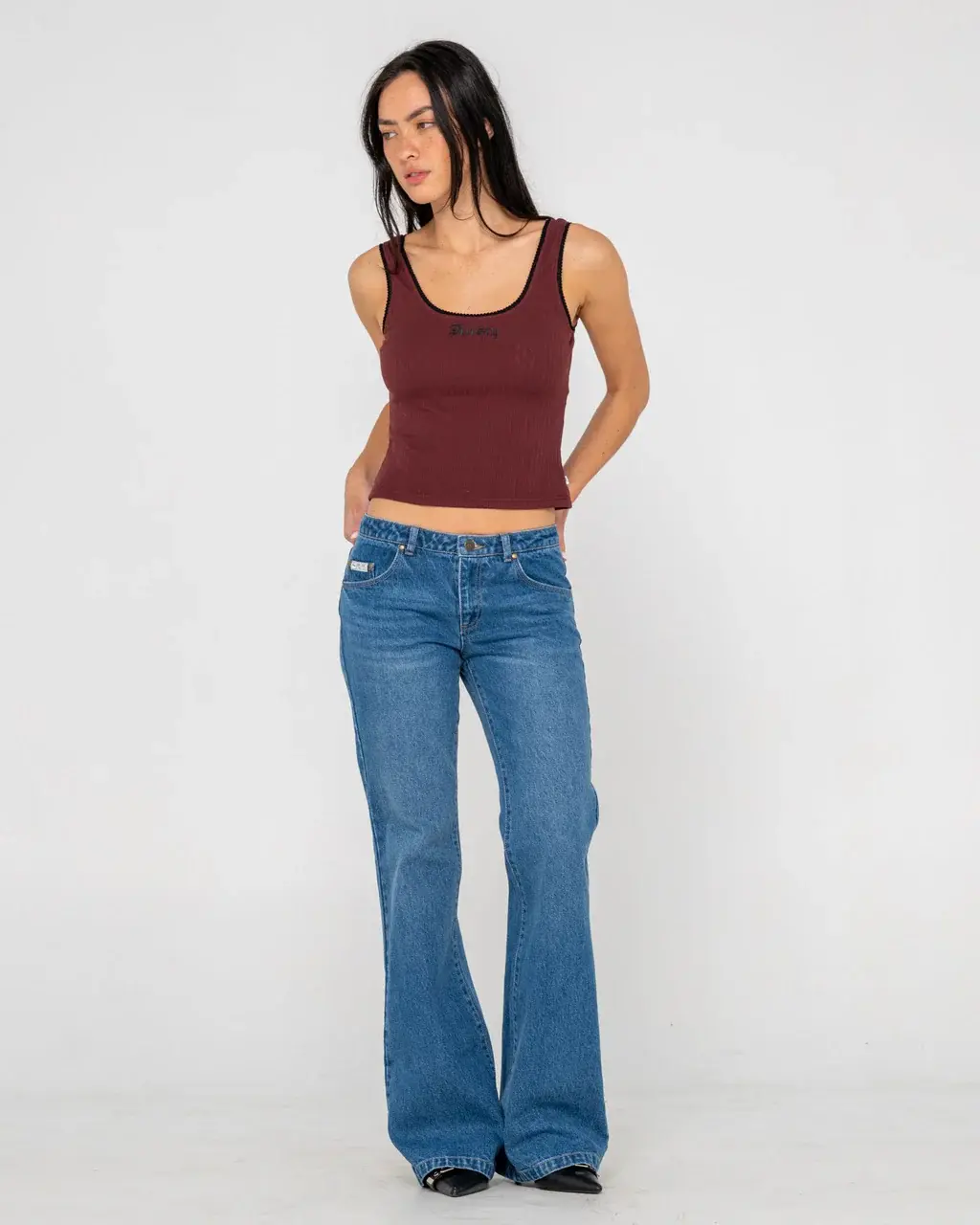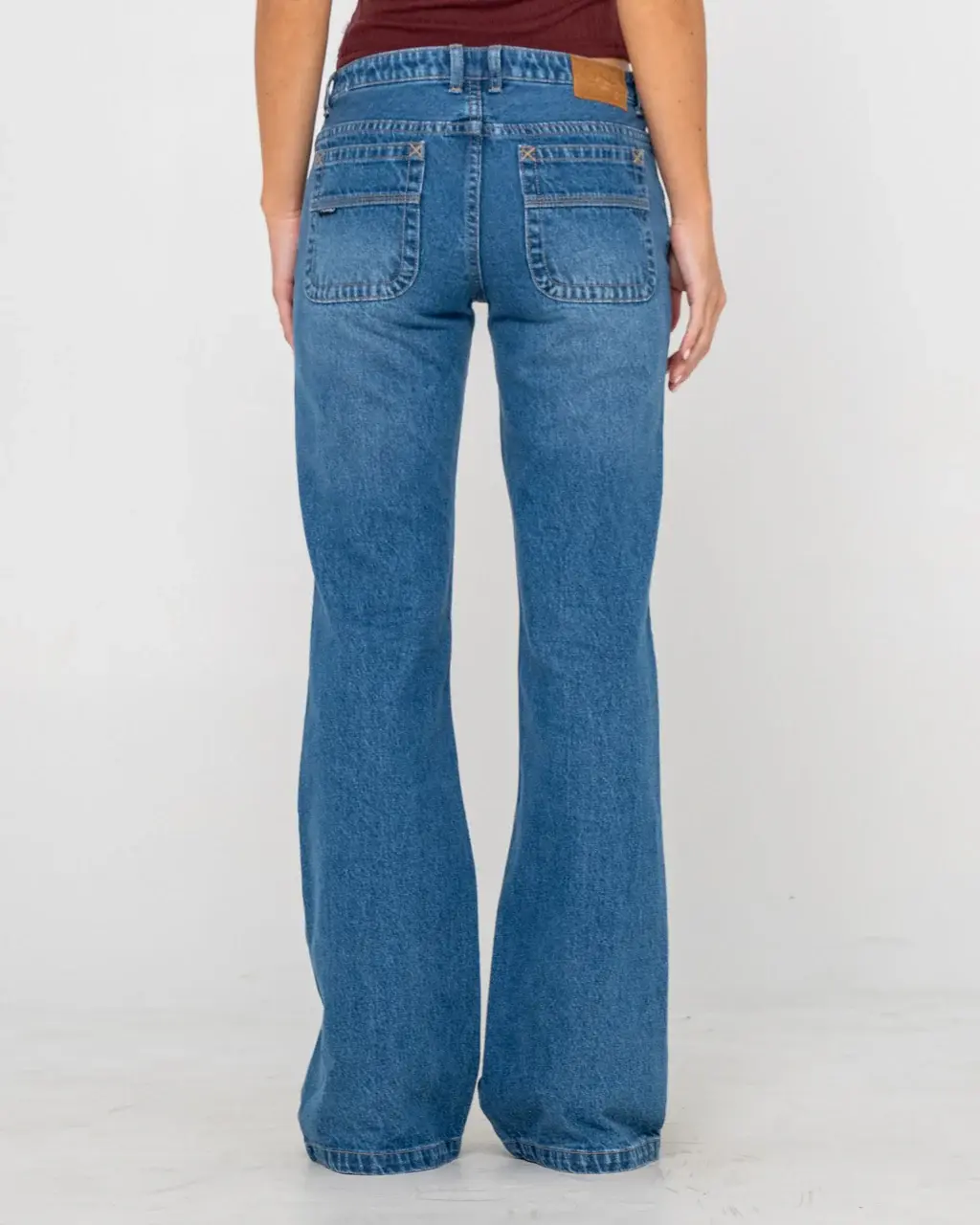 Low Rise Flare Leg Jean With 5 Pkt Detailing And Belt Loops. 100% Cotton Indigo Denim